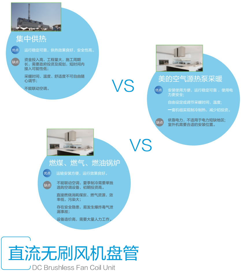 地板采暖方式,根據熱氣上升的原理,提升人體舒適度。不方便做地板采暖的場所,可以選用散熱器和風機盤管,減少系統管路,相比氟系統可減小空氣的干燥程度。