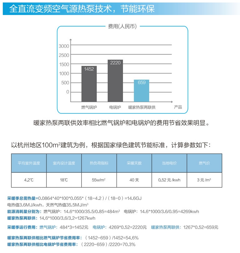 暖家空氣源熱泵兩聯供機組,采用直流電機,從而實現了壓縮機、室外電扇風機、室內風盤電機整體的全直流變頻技術,整機效率比普通交流變頻產品更加節能,暢享更美的低碳家居生活。