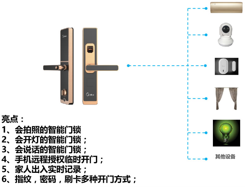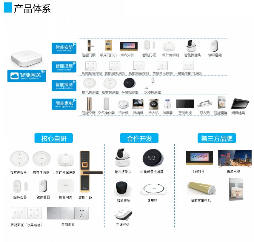 美的智慧產品主要包括美的智能門鎖、攝像頭、紅外人體探測器、可燃氣體探測器、煙霧探測器、水浸探測器、一鍵報警器等,涵蓋智能安防、智能控制、智能探測等方面。美的智慧家居在智能門鎖、智能網關、智能燈光、智能安防以及智能家電方面,都實現了產品的真正落地,成功為用戶打造出了多個智慧家居生活場景。