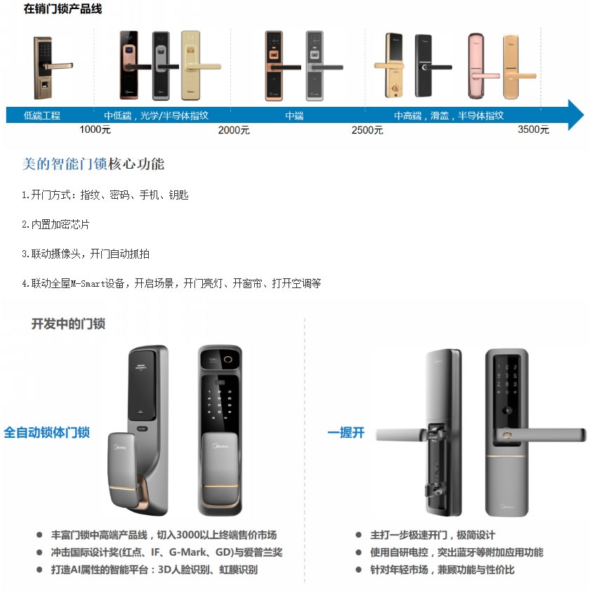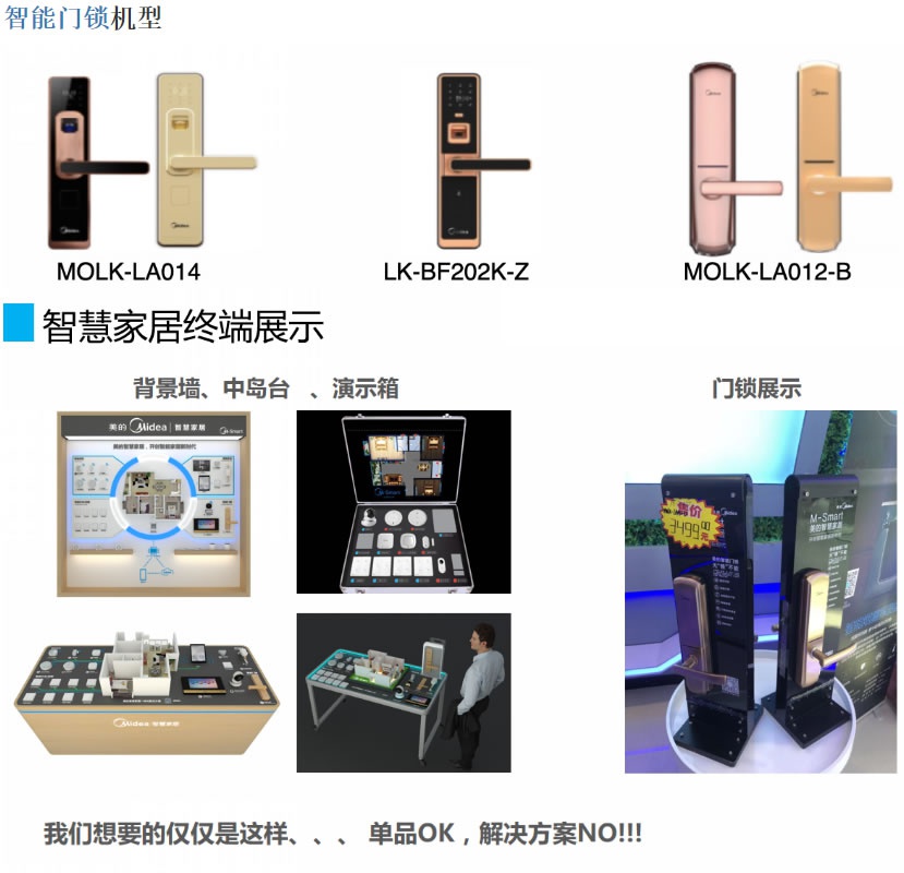 以智能門鎖為入口,構建美的智慧家居整體解決方案。智慧家居解決方案的終端展示體驗是“美”與“智”的結合體 ,強調帶入感。始于顏值、陷于智慧、定于方案、成于專業。軟裝的美感和好的體驗,是解決方案終端成功的關鍵。