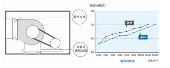 低噪音風機經過嚴格的動、靜平衡實驗,噪音更低,風機出風口采用柔性連接,風機底座與壁板彈性減震,從內部結構減少振動產生的噪音。