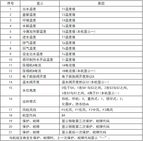 注:2個小時內保護連續出現3次,則機組不再啟動,顯示保護代碼,必須重新斷電上電。當機組沒有發生保護、故障時,上一次保護、故障代碼顯示“--”。