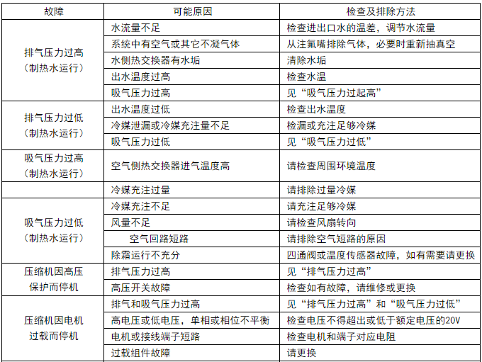 12)長期運行后,水側換熱器傳熱表面會沉積碳酸鈣或其它礦物質,這些物質在傳熱表面結垢較多時,會影響傳熱性能而導致耗電增加、排氣壓力過高(或吸氣壓力過低)??刹捎眉姿帷幟仕?、醋酸等有機酸清潔劑清洗。禁止用含氯酸或氟化物的清潔劑,因水側換熱器的材料是不銹鋼或銅,容易被其腐蝕,導致冷媒泄漏。