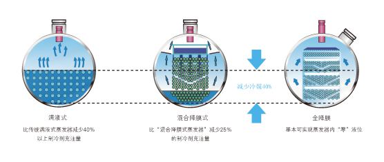 采用行業(yè)首創(chuàng)的全降膜蒸發(fā)器,使同等冷量的機組減少40%的冷媒充注量,對大氣的破壞越少。