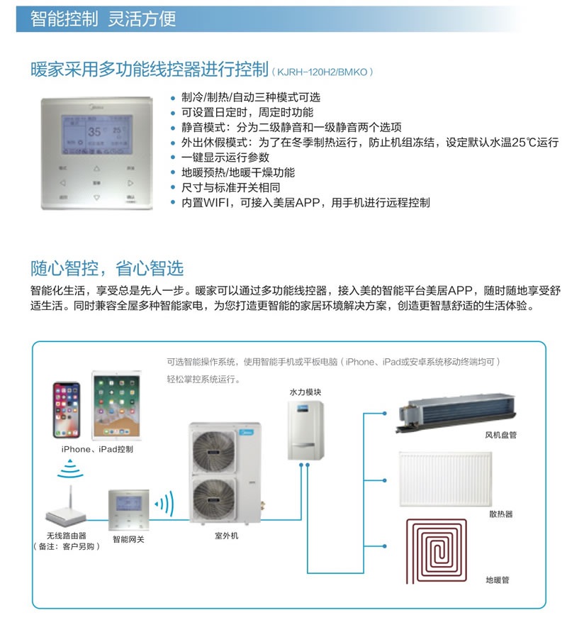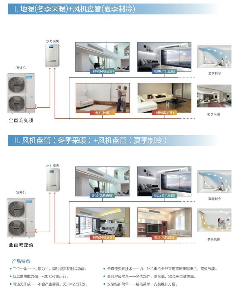 隨著生活水平的提高,人們對室內環境的要求不斷提升。傳統的氟系統空調在冬天送風供暖舒適度不理想,采用其它的采暖設備,又會增加空調系統的復雜性與成本。美的暖家空氣源熱泵兩聯供機組可以解決這個痛點,一套系統可以輕松實現智能制冷與舒適供暖。