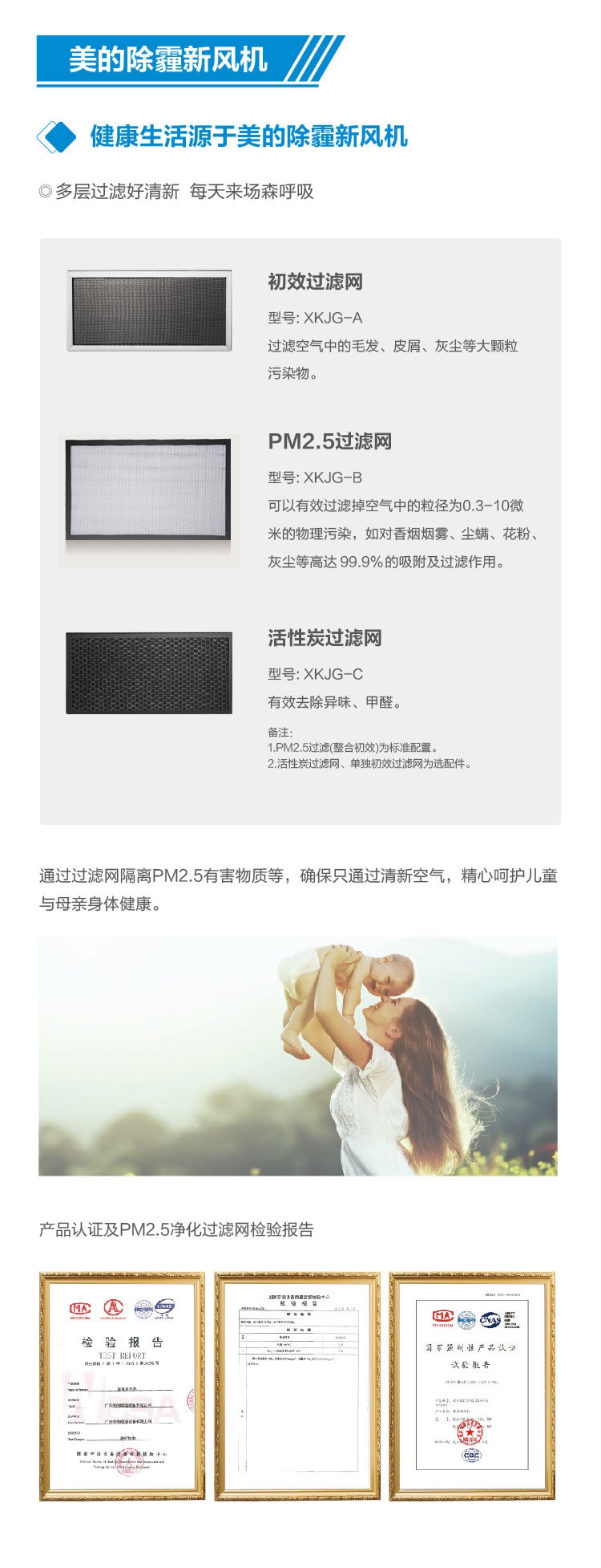 首層初效過濾網過濾空氣中的毛發、皮屑、灰塵等大顆粒污染物;第二層PM2.5過濾網有效過濾空氣中的顆粒直徑0.3-10微米的物理污染,對香煙煙霧、塵螨、花粉等高達97%的吸附及過濾作用;第三層活性炭過濾網能過有效的去除甲醛和異味。三重過濾各司其職,確保了空氣的清潔新鮮。