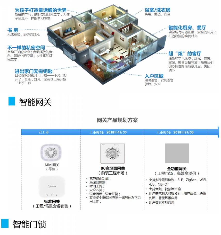 美的智慧產品主要包括美的智能門鎖、攝像頭、紅外人體探測器、可燃氣體探測器、煙霧探測器、水浸探測器、一鍵報警器等,涵蓋智能安防、智能控制、智能探測等方面。美的智慧家居在智能門鎖、智能網關、智能燈光、智能安防以及智能家電方面,都實現了產品的真正落地,成功為用戶打造出了多個智慧家居生活場景。