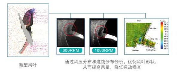 通過CFD優(yōu)化設(shè)計(jì),改善空氣能換熱風(fēng)道,使機(jī)組在單位時(shí)間內(nèi)有更多的空氣與換熱器進(jìn)行熱交換。此外,優(yōu)化設(shè)計(jì)后的風(fēng)葉,其噪音值并未隨風(fēng)量的增大而升高,依舊保持在較低水平。
