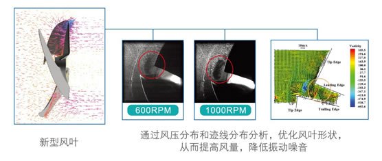 通過(guò)CFD優(yōu)化設(shè)計(jì),改善空氣能換熱風(fēng)道,使機(jī)組在單位時(shí)間內(nèi)有更多的空氣與換熱器進(jìn)行熱交換。此外,優(yōu)化設(shè)計(jì)后的風(fēng)葉,其噪音值并未隨風(fēng)量的增大而升高,依舊保持在較低水平。